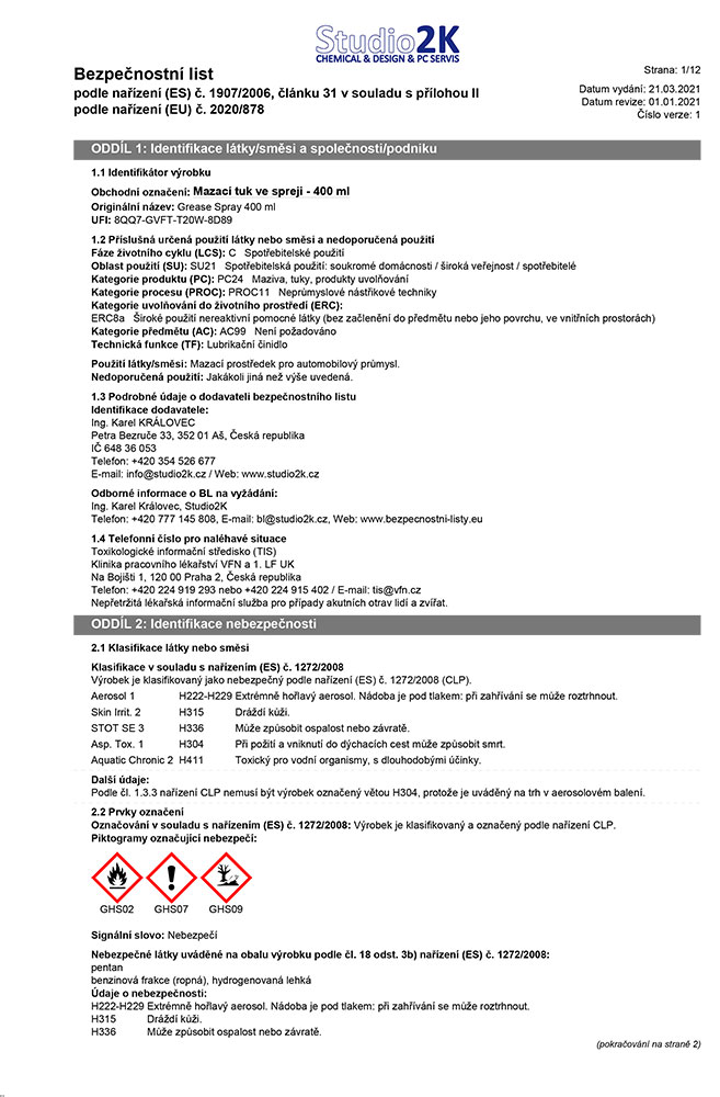 Aktualizace starších vydání bezpečnostních listů podle nařízení REACH (č. 1907/2006), nařízení CLP (1272/2008) a nařízení komise (č. 2020/878).